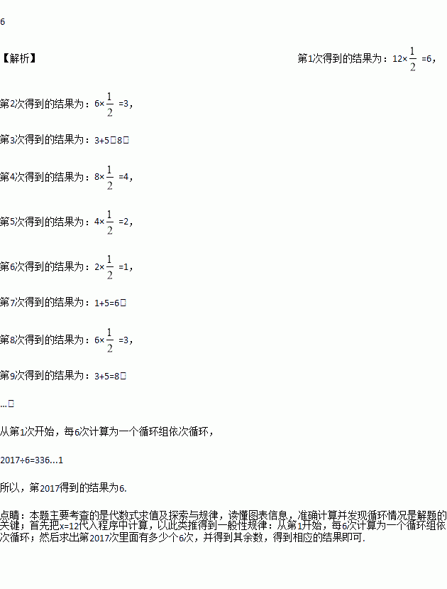 按如图所示的程序计算,若开始输入的x的值为12,我们发现第一次得到的结果为6,第2次得到的结果为3,…,请你探索第2017次得到的结果为_________.