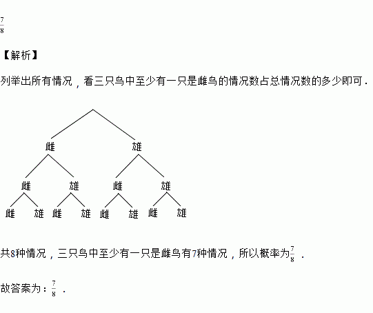 若鸟卵孵化后为雄鸟与雌鸟的概率相同,若三枚鸟卵全部成功孵化,则三只鸟中至少有一只是雌鸟的概率是____.