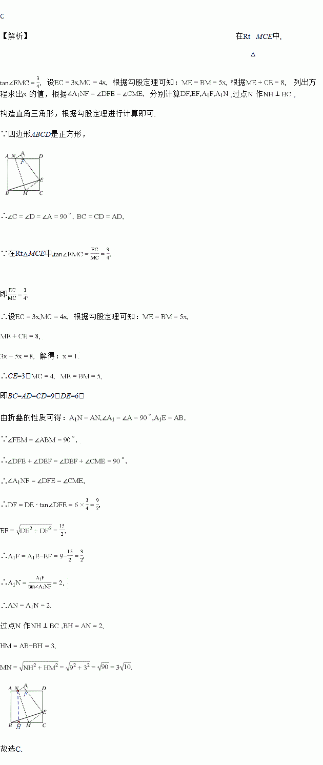 如图,点E在正方形ABCD的CD边上,连结BE,将正方形折叠,使点B与E重合, 折痕MN交BC边于点M,交AD边于点N,若tan∠EMC=