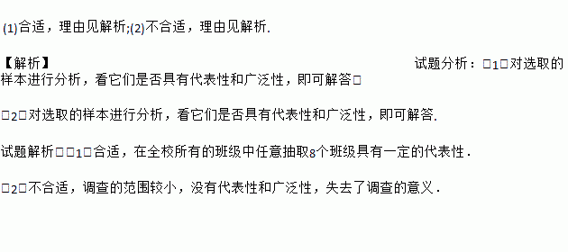 (1)合适,理由见解析;(2)不合适,理由见解析. 【解析】试题分析:(1)对选取的样本进行分析,看它们是否具有代表性和广泛性,即可解答; (2)对选取的样本进行分析,看它们是否具有代表性和广泛性,即可解答. 试题解析:(1)合适,在全校所有的班级中任意抽取8个班级具有一定的代表性. (2)不合适,调查的范围较小,没有代表性和广泛性,失去了调查的意义.