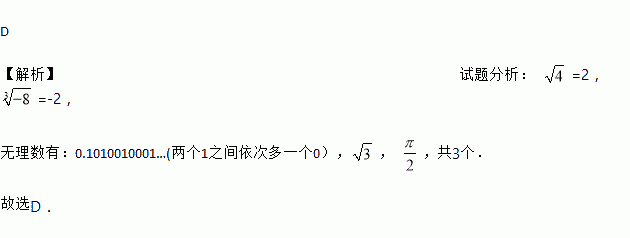D 【解析】试题分析: =2, =-2, 无理数有:0.1010010001…(两个1之间依次多一个0),, ,共3个. 故选D.