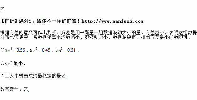 甲、乙、丙三人进行射击测试,每人次射击成绩的平均数均是环,方差分别为,,,则三人中射击成绩最稳定的是________.