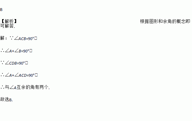 B 【解析】根据图形和余角的概念即可解答. 【解析】 ∵∠ACB=90°, ∴∠A+∠B=90°, ∵∠CDB=90°, ∴∠A+∠ACD=90°, ∴与∠A互余的角有两个. 故选B.