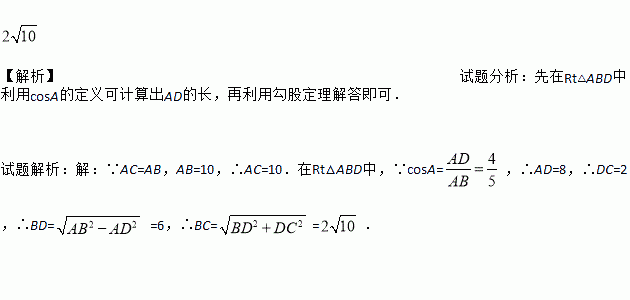 如图,在△ABC中,AB=AC,BD⊥AC于点D.AC=10,cosA=,求BC的长.