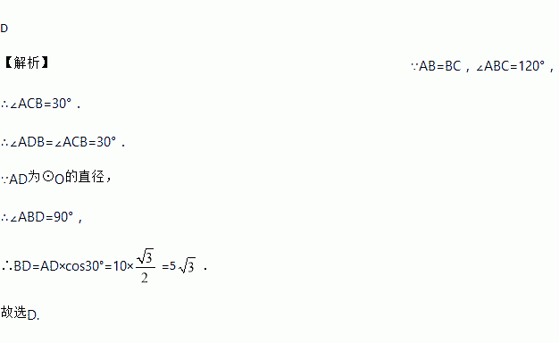 如图,△ABC内接于⊙O,AB=BC,∠ABC=120°,AD为⊙O的直径,AD=10, 那么BD=( )