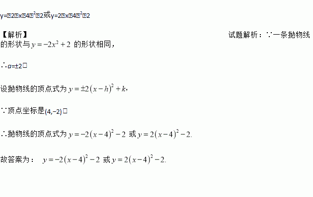 y=﹣2(x﹣4)2﹣2或y=2(x﹣4)2﹣2 【解析】试题解析:∵一条抛物线的形状与的形状相同, ∴a=±2, 设抛物线的顶点式为 ∵顶点坐标是(4,?2), ∴抛物线的顶点式为或 故答案为: 或