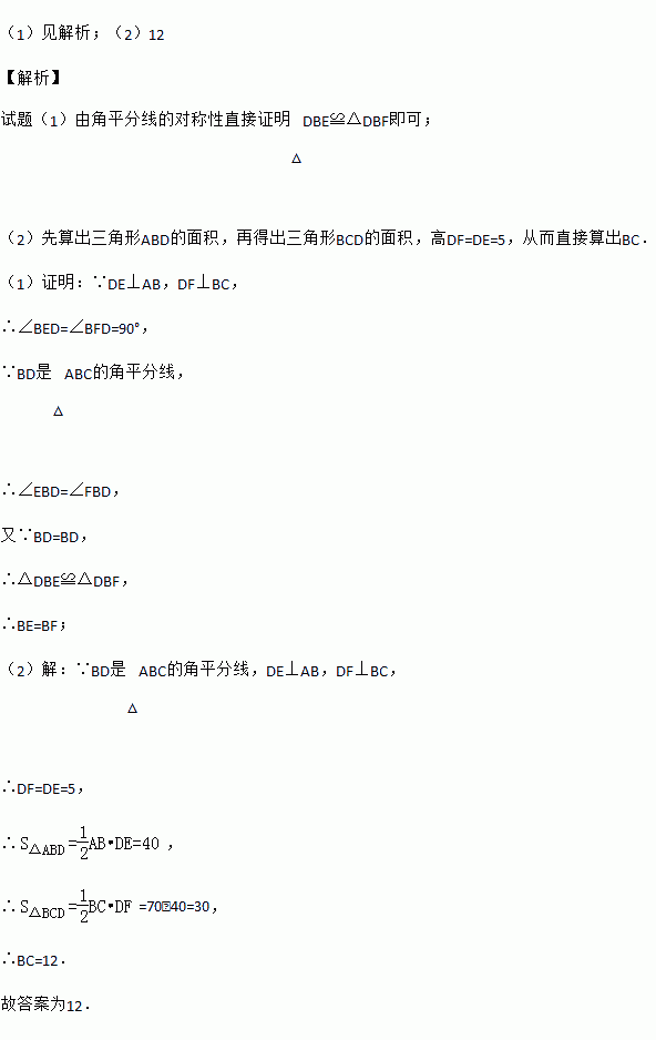 如图,BD是△ABC的角平分线,DE⊥AB,DF⊥BC垂足分别为E、F.