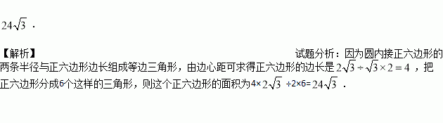 圆内接正六边形的边心距为2,则这个正六边形的面积为_____cm2.