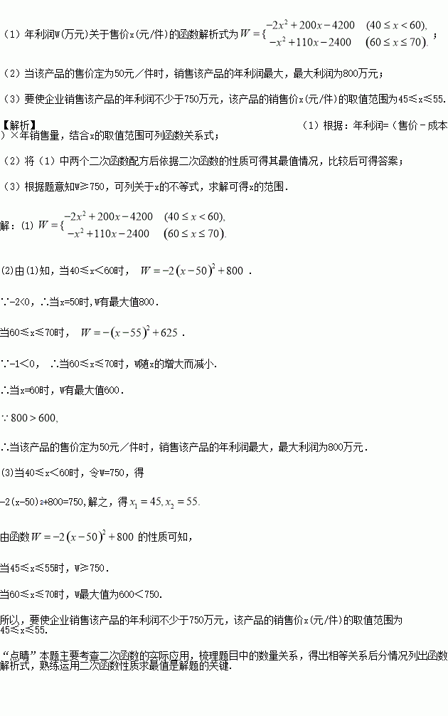 (1)若企业销售该产品获得的利润为W(万元),请直接写出年利润W(万元)关于售价x(元/件)的函数解析式;