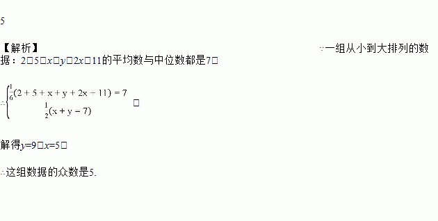 (2017·江西)已知一组从小到大排列的数据:2,5,x,y,2x,11的平均数与中位数都是7,则这组数据的众数是_______.
