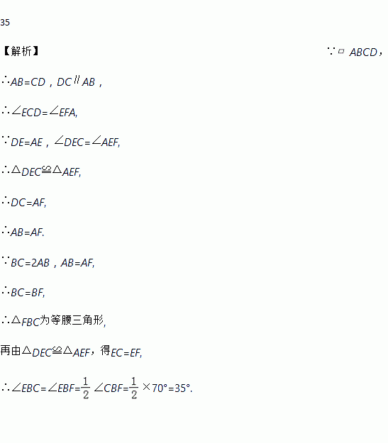 如图所示,在?ABCD中,E为AD中点,CE交BA的延长线于F,若BC=2AB,∠FBC=70°,则∠EBC的度数为__度.