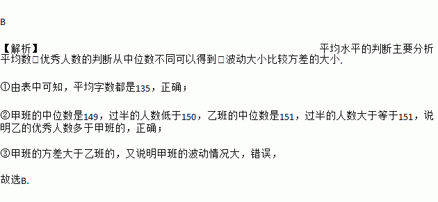 甲、乙两班举行电脑汉字输入比赛,参赛学生每分钟输入汉字的个数统计结果如表:某同学分析表后得出如下结论: