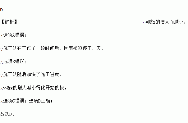 查看答案西海岸旅游旺季到来,为应对越来越严峻的交通形势,新区对某道路进行拓宽改造.工程队在工作了一段时间后,因雨被迫停工几天,随后工程队加快了施工进度,按时完成了拓宽改造任务.下面能反映该工程尚未改造的道路y(米)与时间x(天)的函数关系的大致图象是( )