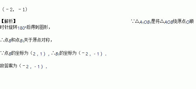 在平面直角坐标系中,将△AOB绕原点O顺时针旋转180°后得到△A1OB1,若点B的坐标为(2,1),则点B的对应点B1的坐标为_____.