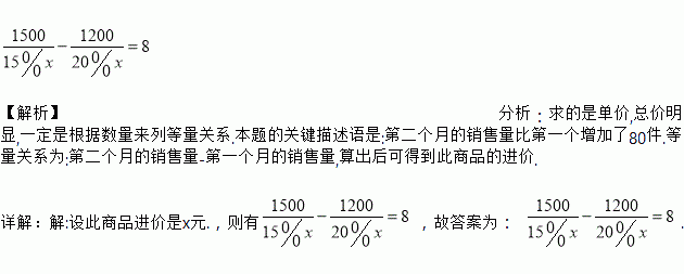 某商场销售一种商品,第一个月将此商品的进价提高20%作为销售价,共获利1 200元,第二个月商场搞促销活动,将此商品的进价提高15%作为销售价,第二个月的销售量比第一个月增加了80件,并且商场第二个月比第一个月多获利300元.设此商品的进价是x元,则可列方程________.