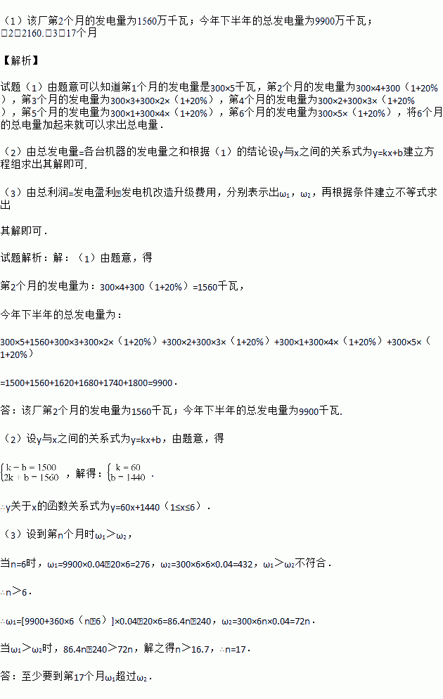 (3)如果每发1千瓦电可以盈利0.04元,那么从第1个月开始,至少要到第几个月,这期间该厂的发电盈利扣除发电机改造升级费用后的盈利总额ω1(万元),将超过同样时间内发电机不作改造升级时的发电盈利总额ω2(万元)?
