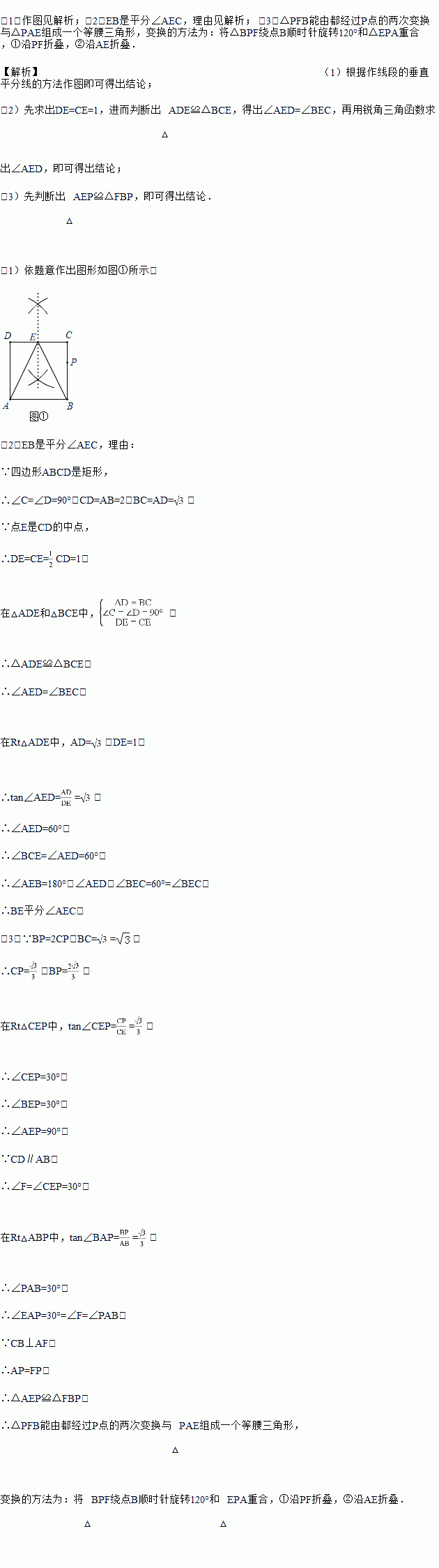 (3)如图③,在(2)的条件下,连接EP并廷长交AB的廷长线于点F,连接AP,不添加辅助线,△PFB能否由都经过P点的两次变换与△PAE组成一个等腰三角形?如果能,说明理由,并写出两种方法(指出对称轴、旋转中心、旋转方向和平移距离)