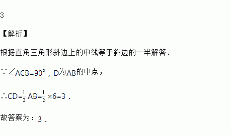 如图,Rt△ABC中,∠ACB=90°,AB=6,D是AB的中点,则CD=_____.