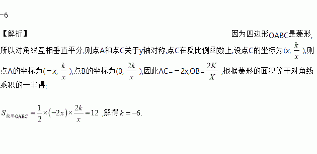 如图,在平面直角坐标系中,菱形OABC的面积为12,点B在y轴上,点C在反比例函数y=的图象上,则k的值为________.