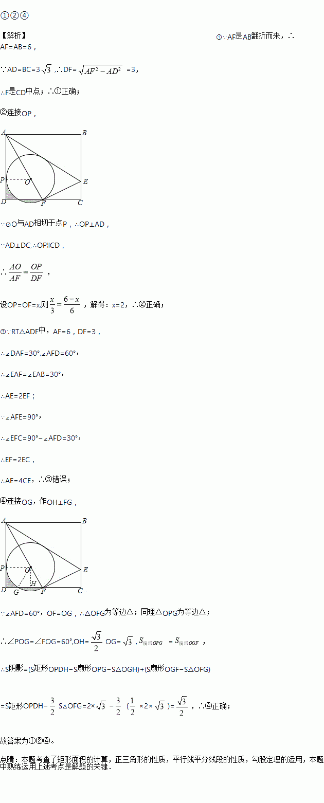 如图,矩形ABCD中,E是BC上一点,连接AE,将矩形沿AE翻折,使点B落在CD边F处,连接AF,在AF上取点O,以O为圆心,OF长为半径作⊙O与AD相切于点P.若AB=6,BC=3