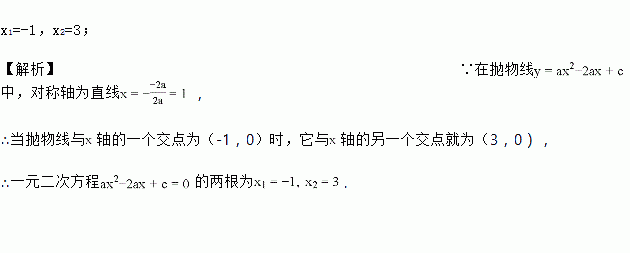 已知抛物线y=ax2﹣2ax+c与x轴一个交点的坐标为(﹣1,0),则一元二次方程ax2﹣2ax+c=0的根为______.