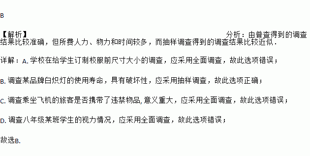 A. 学校在给学生订制校服前尺寸大小的调查 B. 调查某品牌白炽灯的使用寿命
