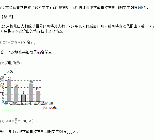 若该中学共有学生1200人,请你估计该中学最喜欢香炉山的学生约有多少人.![]()