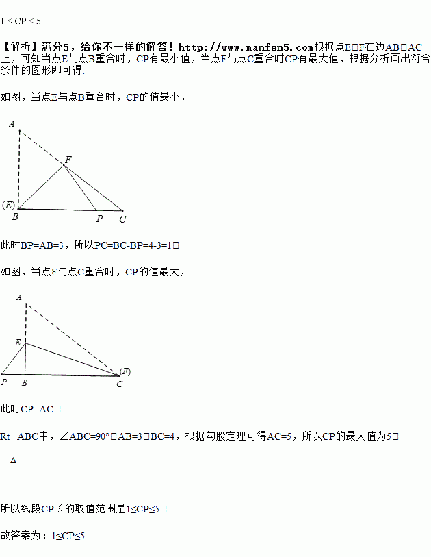在Rt△ABC中,∠ABC=90°,AB=3,BC=4,点E,F分别在边AB,AC上,将△AEF沿直线EF翻折,点A落在点P处,且点P在直线BC上.则线段CP长的取值范围是____.
