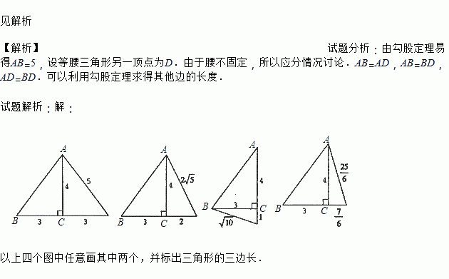 如图,在Rt△ABC中,∠C=90,AC=4,BC=3.在Rt△ABC的外部拼接一个合适的直角三角形,使得拼成附图形是一个等腰三角形,如图所示.![]()