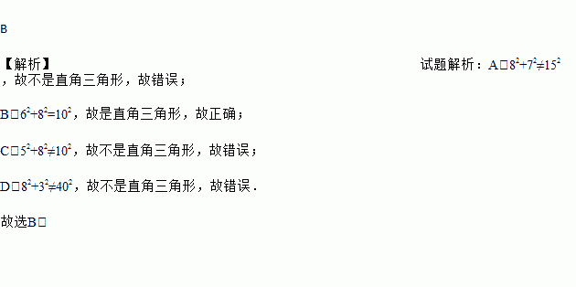 A. 8、15、7 B. 8、10、6 C. 5、8、10 D. 8、39、40