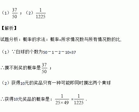 £¨1£©£»£¨2£© ¡¾½âÎö¡¿ ÊÔÌâ·ÖÎö£º¸ÅÂʵÄÇ󷨣º¸ÅÂÊ=ËùÇóÇé¿öÊýÓëËùÓÐÇé¿öÊýµÄ±È. £¨1£©¡ß°×ÇòµÄ¸öÊýΪ50£1£2£10=37 ¡àÃþ²»µ½½±µÄ¸ÅÂÊÊÇ£» £¨2£©»ñµÃ10ÔªµÄ½±Æ·Ö»ÓÐÒ»ÖÖ¿ÉÄܼ´Í¬Ê±Ãþ³öÁ½¸ö»ÆÇò ¡à»ñµÃ10Ôª½±Æ·µÄ¸ÅÂÊÊÇ£º=.