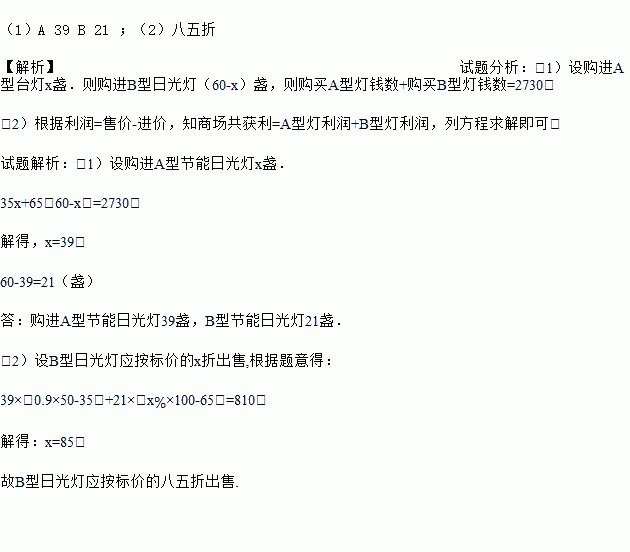 (1)A 39 B 21 ;(2)八五折 【解析】试题分析:(1)设购进A型台灯x盏.则购进B型日光灯(60-x)盏,则购买A型灯钱数+购买B型灯钱数=2730. (2)根据利润=售价-进价,知商场共获利=A型灯利润+B型灯利润,列方程求解即可. 试题解析:(1)设购进A型节能日光灯x盏. 35x+65(60-x)=2730, 解得,x=39, 60-39=21...