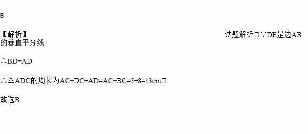 如图,在△ABC中,DE是边AB的垂直平分线,BC=8cm,AC=5cm,则△ADC的周长为( )