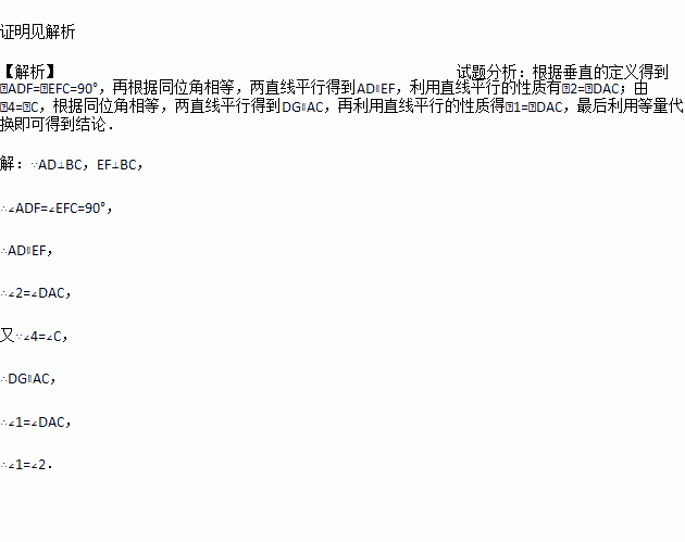 已知,如图,AD⊥BC,EF⊥BC,∠4=∠C.求证:∠1=∠2.