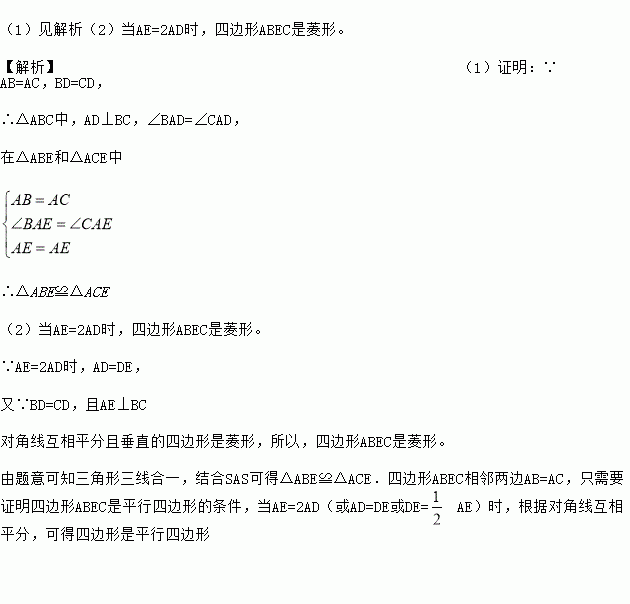 (2)当AE与AD满足什么数量关系时,四边形ABEC是菱形?并说明理由.