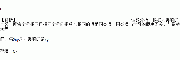 C 【解析】试题分析:根据同类项的定义,所含字母相同且相同字母的指数也相同的项是同类项,同类项与字母的顺序无关,与系数无关. 【解析】 与2xy是同类项的是xy. 故选:C.