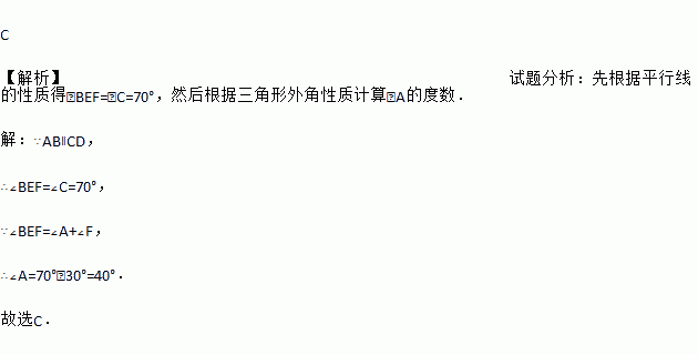 如图,已知AB∥CD,∠C=70°,∠F=30°,则∠A的度数为( )
