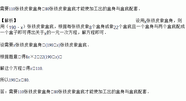 现用190张铁皮做盒子,每张铁皮能做8个盒身或做22个盒底,而一个盒身和两个盒底配成一个盒子,那么需要多少张铁皮做盒身,多少张铁皮做盒底才能使加工出的盒身与盒底配套?