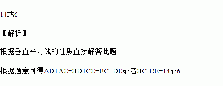 在△ABC中,BC=10,AB的垂直平分线与AC的垂直平分线分别交BC于点D、E,且DE=4,则AD+AE的长度为________________