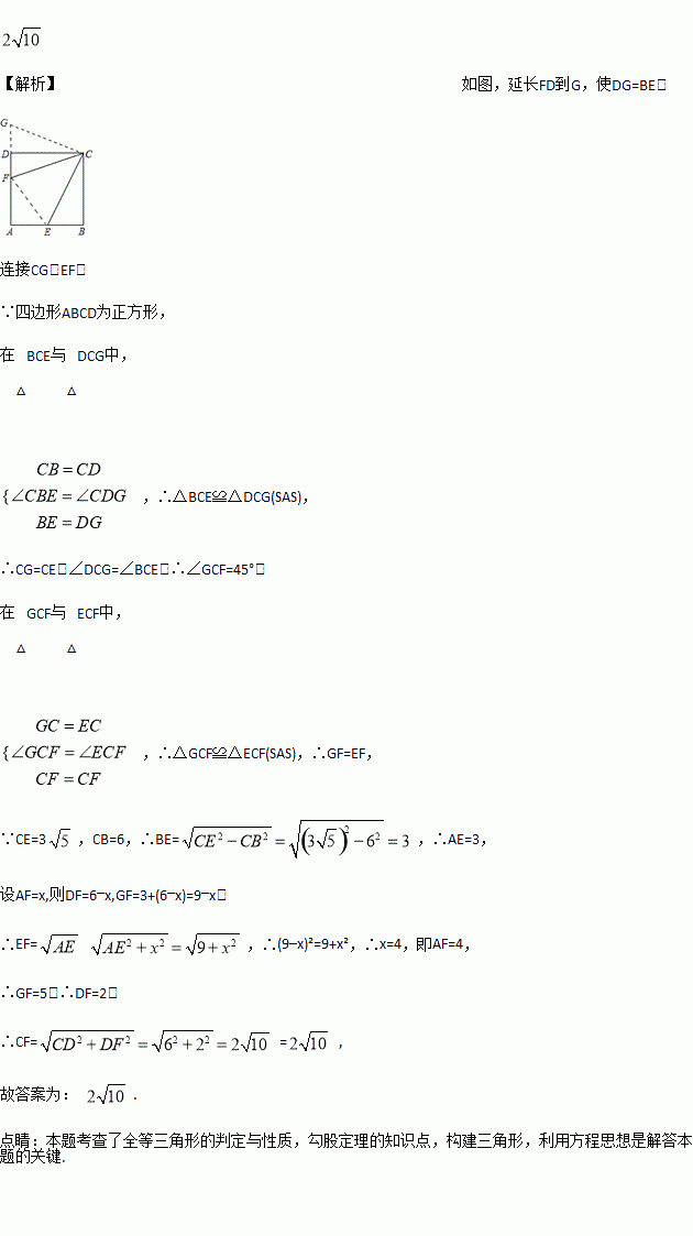 如图,正方形ABCD的边长为6,点E,F分别在AB,AD上,若CE=,且∠ECF=45°,则CF的长为__________.