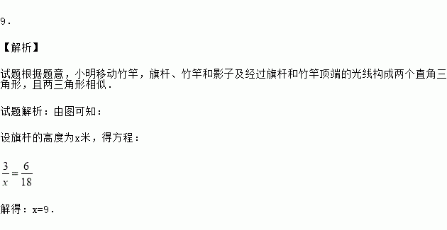 如图,小明用长为3cm的竹竿CD做测量工具,测量学校旗杆AB的高度,移动竹竿,使竹竿、旗杆顶端的影子恰好落在地面的同一点O,此时O点与竹竿的距离OD=6m,竹竿与旗杆的距离DB=12m,则旗杆AB的高为 m.