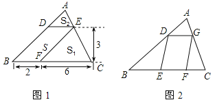 问题背景:(1)如图1,△ABC中,DE∥BC分别交AB,AC于D,E两点,过点E作EF∥AB交BC于点F。请按图示数据填空:四边形DBFE的面积______,△EFC的面积______,△ADE的面积______。