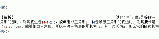 等腰三角形的周长为14,其一边长为4,那么它的底边为________。