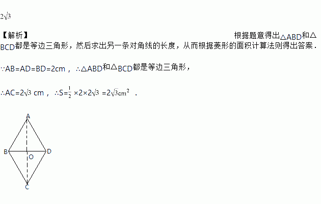 已知菱形的边长和一条对角线的长均为,则菱形的面积为__________ cm2.![]()