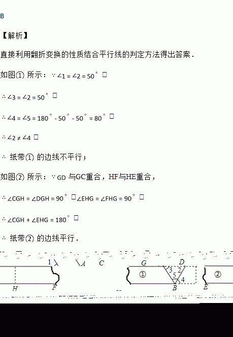 一次数学活动中,检验两条纸带①、②的边线是否平行,小明和小丽采用两种不同的方法如图:小明对纸带①沿AB折叠,量得∠1=∠2=50°;小丽对纸带②沿GH折叠,发现GD与GC重合,HF与HE重合.则下列判断正确的是( )