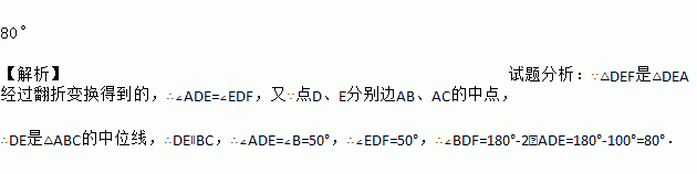 如图,点D、E分别边AB、AC的中点,将△ADE沿着DE对折,点A落在BC边的点F上,若∠B=50o,则∠BDF=_________