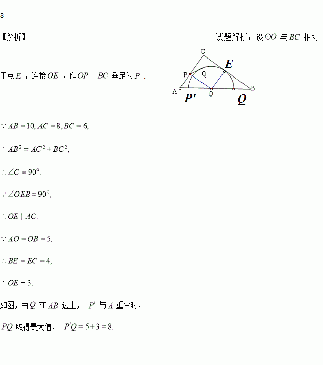 如图,在△ABC中,AB=10,AC=6,BC=8,以边AB的中点O为圆心,作半圆与BC相切,点P、Q分别是边AC和半圆上的动点,连接PQ,则PQ长的最大值等于_______.