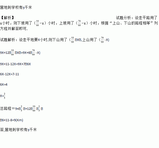 营地到学校有9千米 【解析】试题分析:设走平路用了x小时,则下坡用了(-x)小时,上坡用了(-x)小时,根据“上山、下山的路程相等”列方程并解答即可. 试题解析:设走平地要X小时,则下山用了(-X),上山用了(-X) 9X+12(-X)=9X+6(-X) 9X+11-12X=9X+7-6X 6X-12X=7-11 6X=4 X= 总路程=9×()+1...