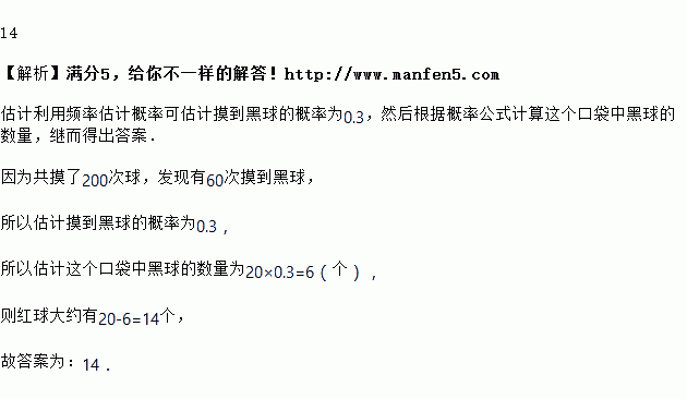 在一个不透明的布袋中,红色、黑色的玻璃球共有20个,这些球除颜色外其它完全相同.将袋中的球搅匀,从中随机摸出一个球,记下颜色后再放回袋中,不断地重复这个过程,摸了200次后,发现有60次摸到黑球,请你估计这个袋中红球约有_____个.