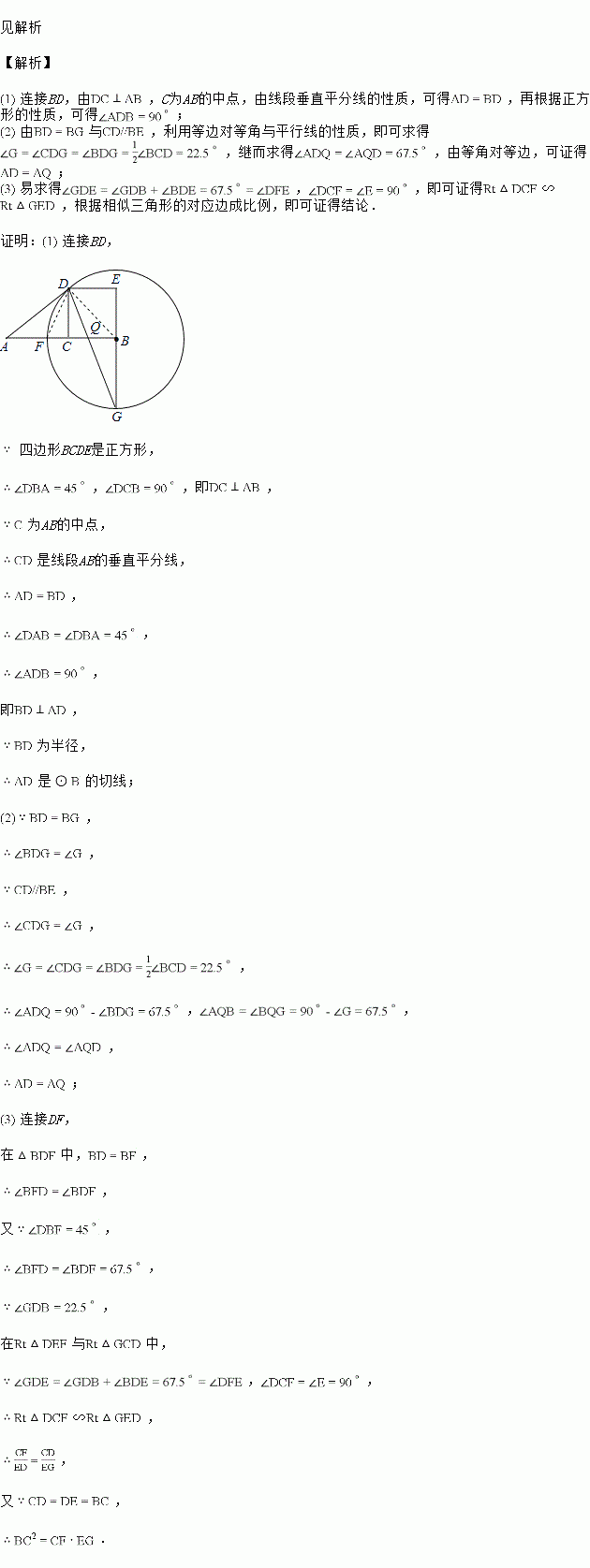 设C为线段AB的中点,四边形BCDE是以BC为一边的正方形以B为圆心,BD长为半径的与AB相交于F点,延长EB交于G点,连接DG交于AB于Q点,连接AD.